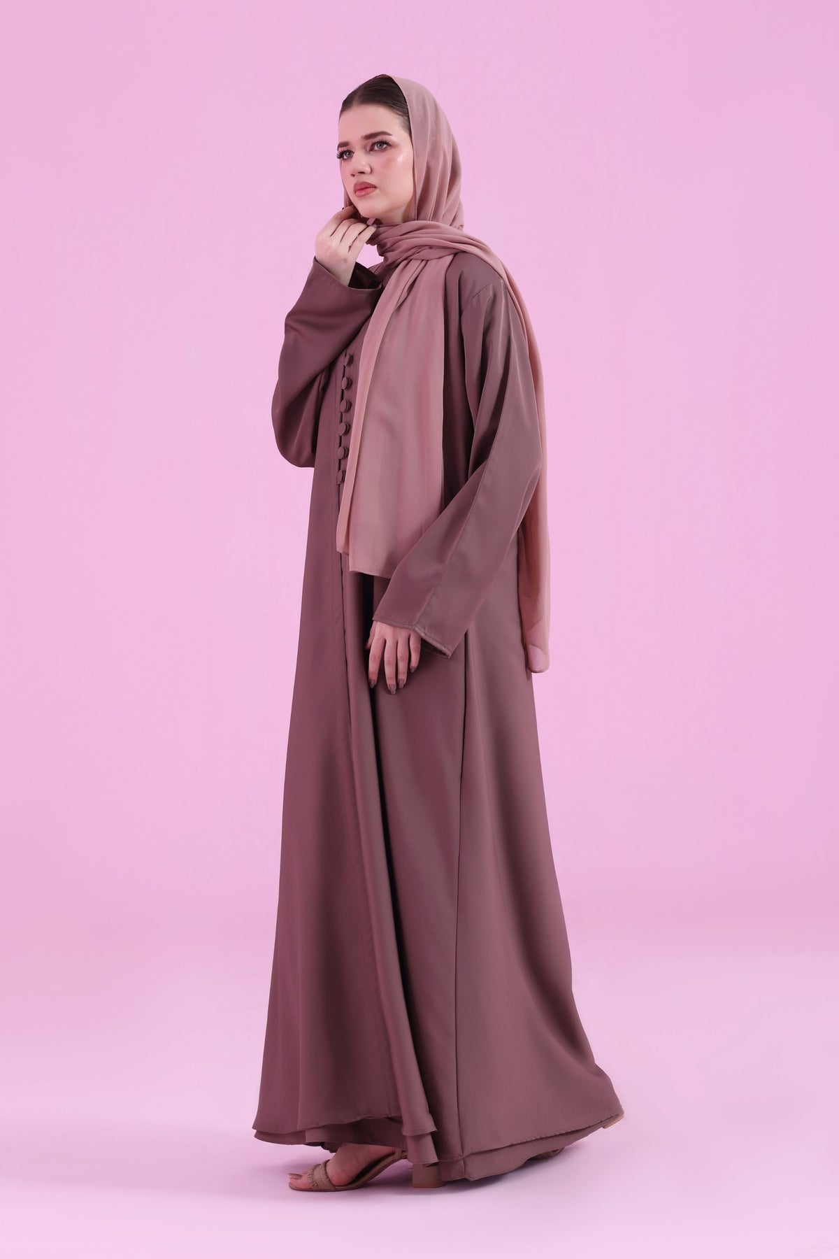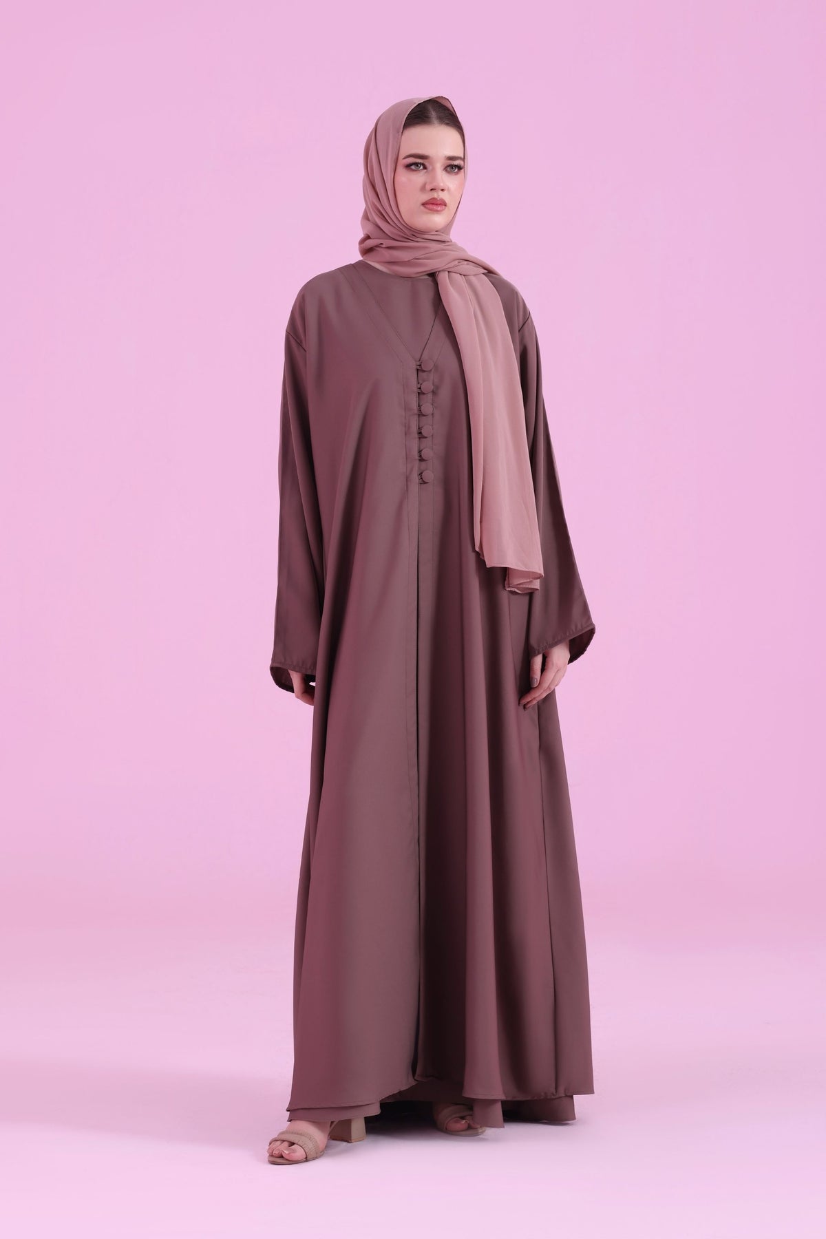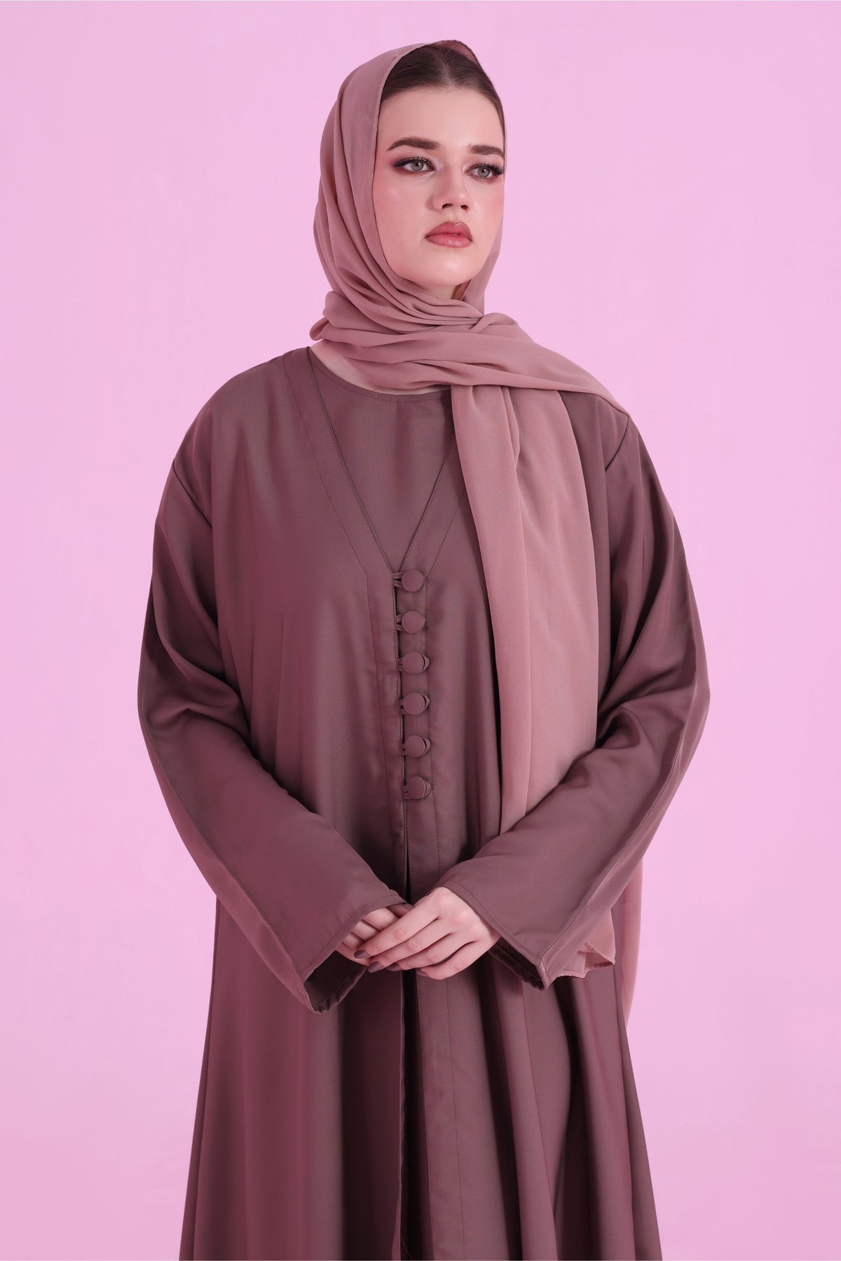 Featuring a flowy A-line cut and a classic round neckline, this abaya is enhanced with minimal button detailing on the front neckline for a subtle yet refined touch. Its simple and elegant design makes it ideal for daily wear, casual outings, or Umrah/Hajj.