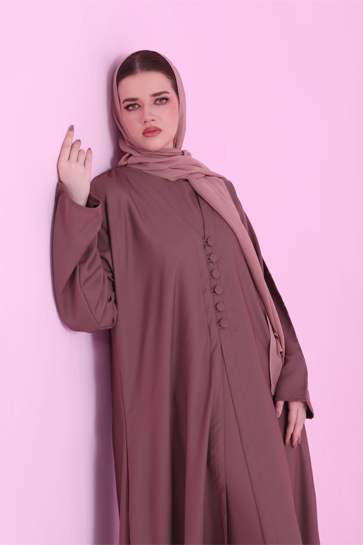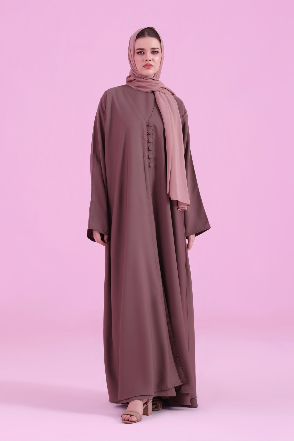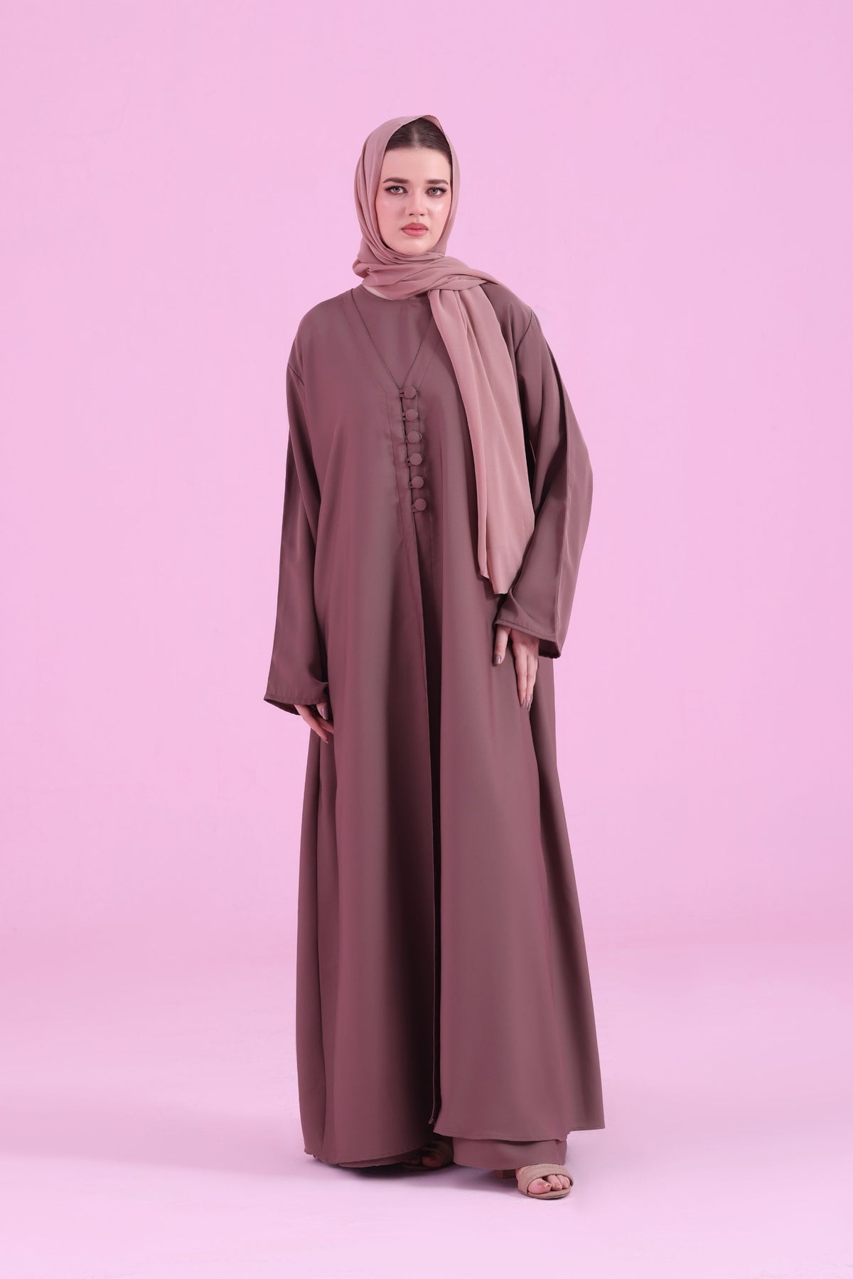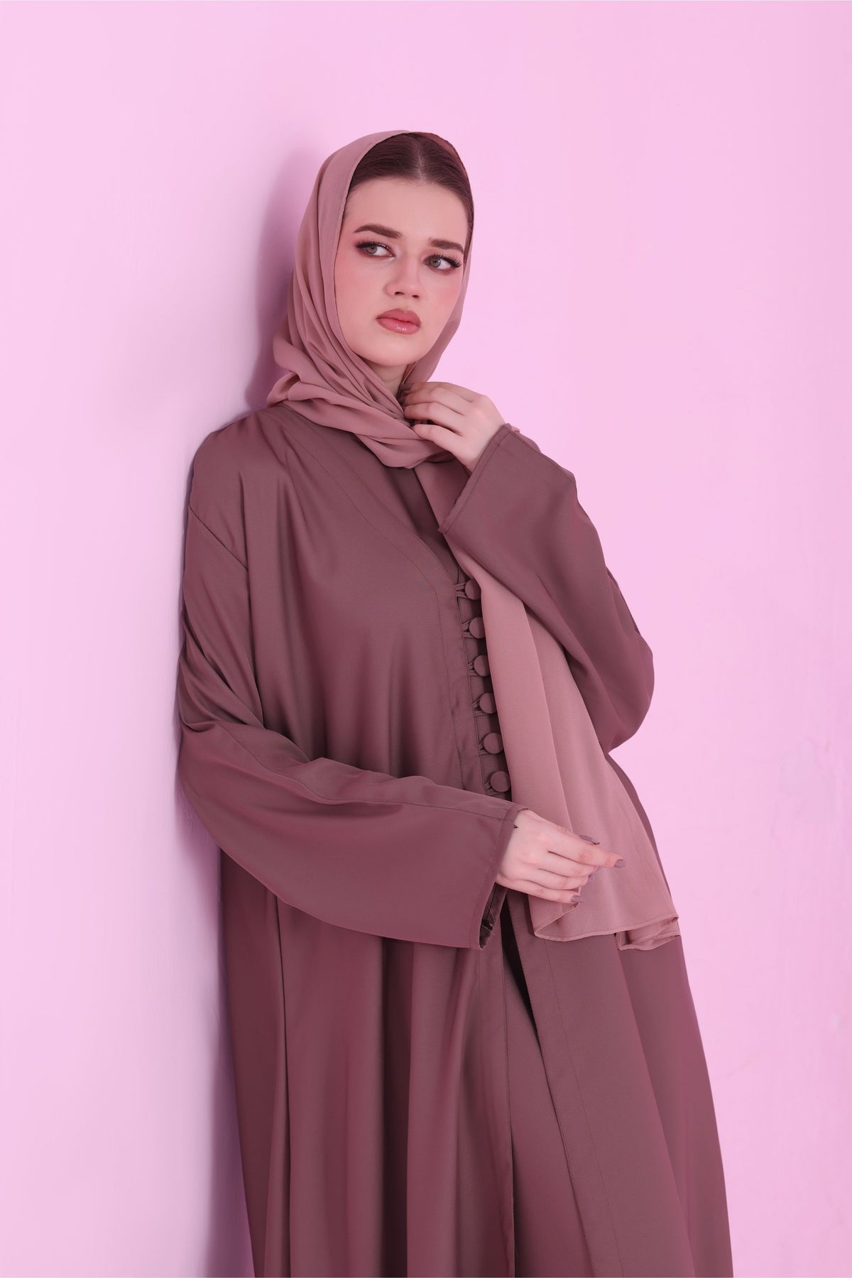 Featuring a flowy A-line cut and a classic round neckline, this abaya is enhanced with minimal button detailing on the front neckline for a subtle yet refined touch. Its simple and elegant design makes it ideal for daily wear, casual outings, or Umrah/Hajj.